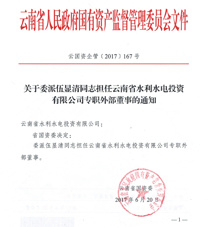云南省國資委關于委派伍顯清同志擔任公司專職外部董事的通知